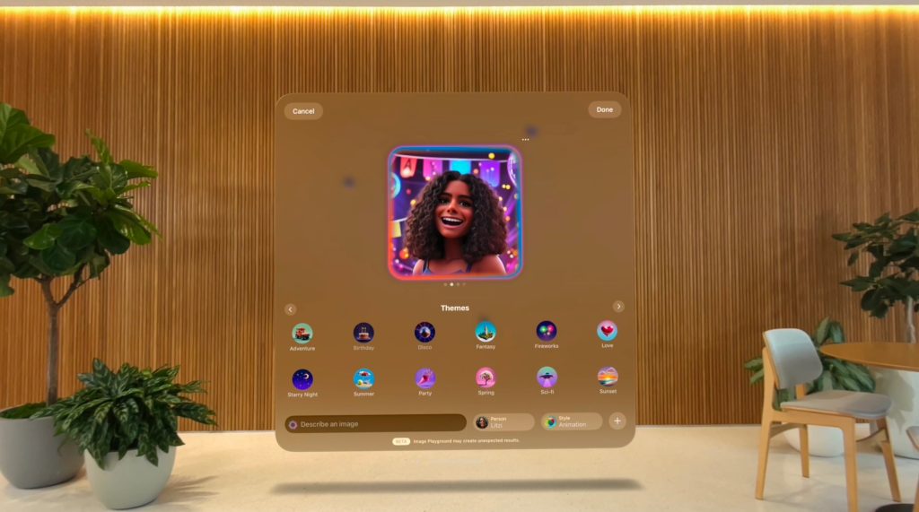 Image Playground allows you to create images based on concepts, text descriptions, and people from your Photos library. You can access Image Playground with a dedicated app that has been designed specifically to take advantage of Vision Pro’s spatial computing interface. Just like on other platforms, it’s also integrated right into Messages.