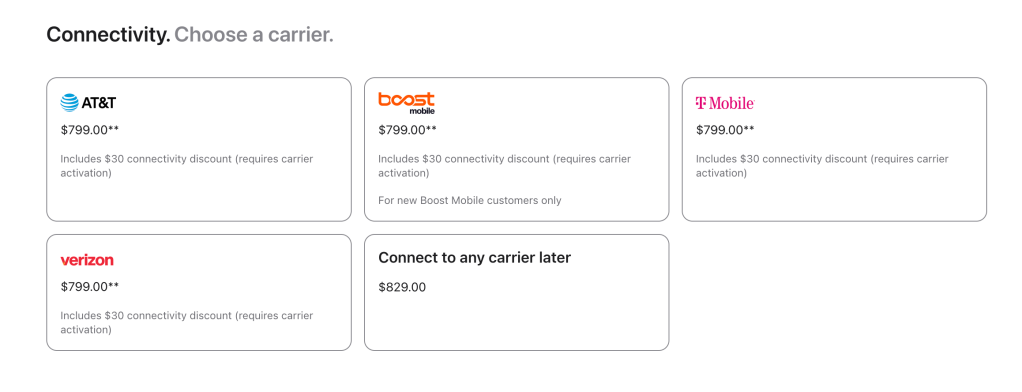 When 5G debuted with the iPhone 12 lineup, Apple introduced a sneaky new pricing tactic. Apple would list iPhones as “starting at $799”, but that price would require you to activate with one of the major US carriers at the point of purchase. If you wanted an unlocked iPhone, the actual starting price point was $829.