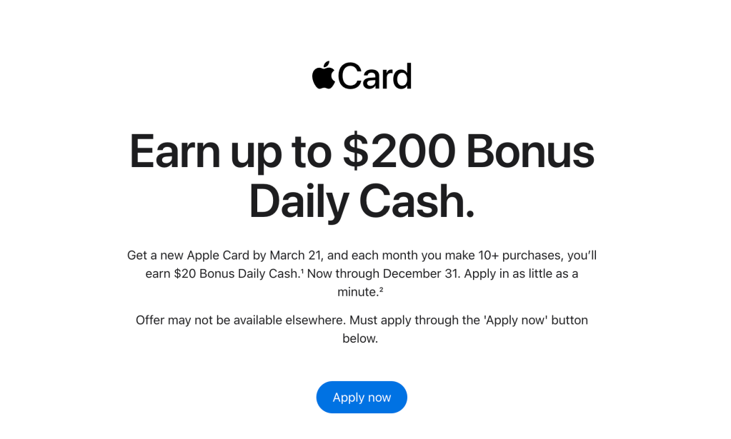 If you apply and get approved for an Apple Card by March 21st through this link, you can earn a special sign up bonus of up to $200. It doesn’t necessarily have a standard minimum spend requirement, though you still need to regularly use the card to earn this bonus.