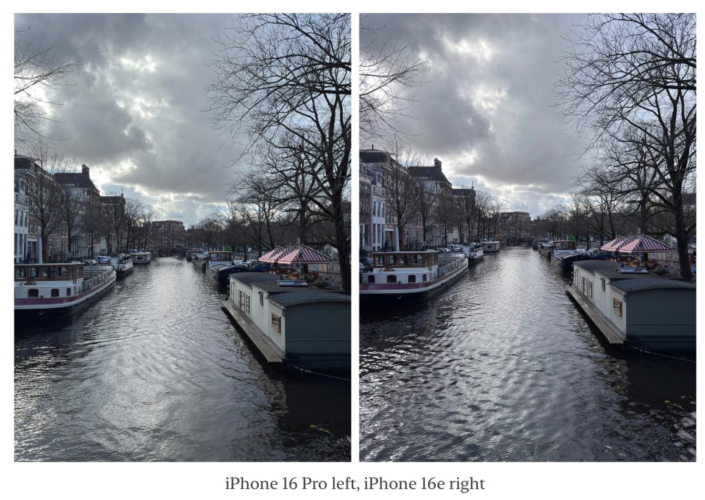 Notice anything a little different? Aside from color (iPhone 16e consistently took pinker, warmer shots) — the iPhone 16e gives you a slightly narrower field of view. Its camera isn’t quite as wide angle as the iPhone 16 Pro’s, by about a 2mm focal length (26mm vs. 24mm equivalent). In practice, that felt nice to me — you lack a separate zoom lens, so a little bit closer of a zoom is a nice trade-off.
