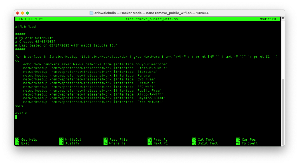Copy and paste my script into the new remove_public_wifi.sh file. You can change and add as many SSIDs as you like in the list below.