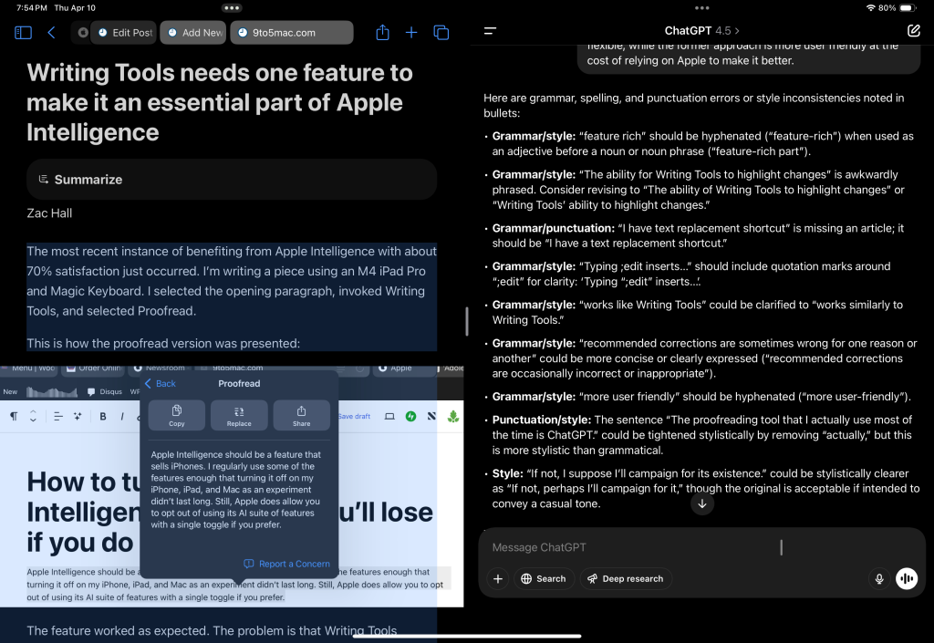 The most recent instance of benefiting from Apple Intelligence with about 70% satisfaction just occurred. I’m writing another piece using an M4 iPad Pro and Magic Keyboard. I selected the opening paragraph, invoked Writing Tools, and selected Proofread.