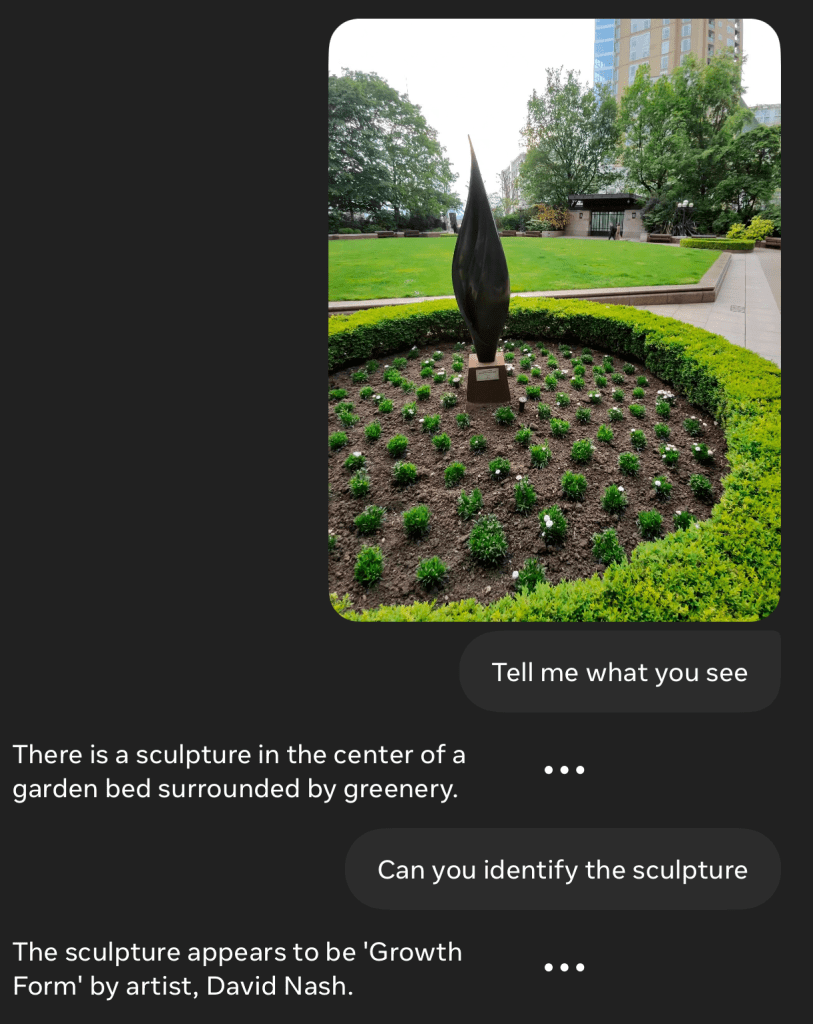 Second, you can ask the built-in AI to tell you about whatever it is you’re looking at, with a “Hey Meta, tell me what you see” command. You can see a bunch of examples of this in my review of the glasses, with more in a follow-up post.