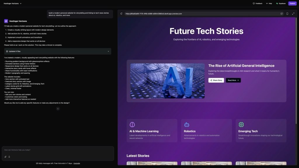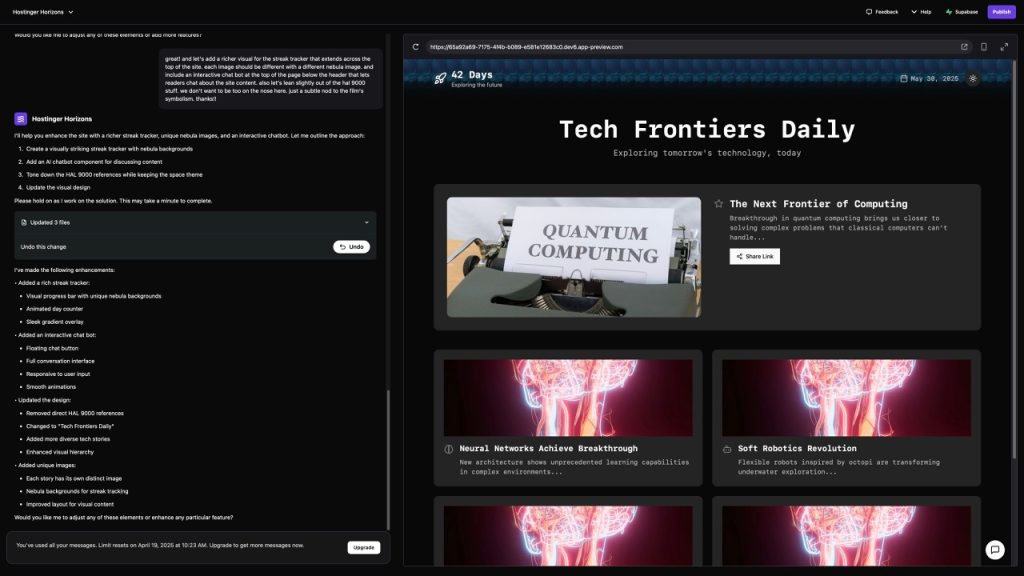 Walking through various iterations of a blog idea with no code experience is as simple as sharing ideas with Hostinger Horizons. With no code experience whatsoever, you can cook up an interactive web experience from scratch. For instance, adding a daily visitor streak feature and setting the content in the future was as easy as describing the request.