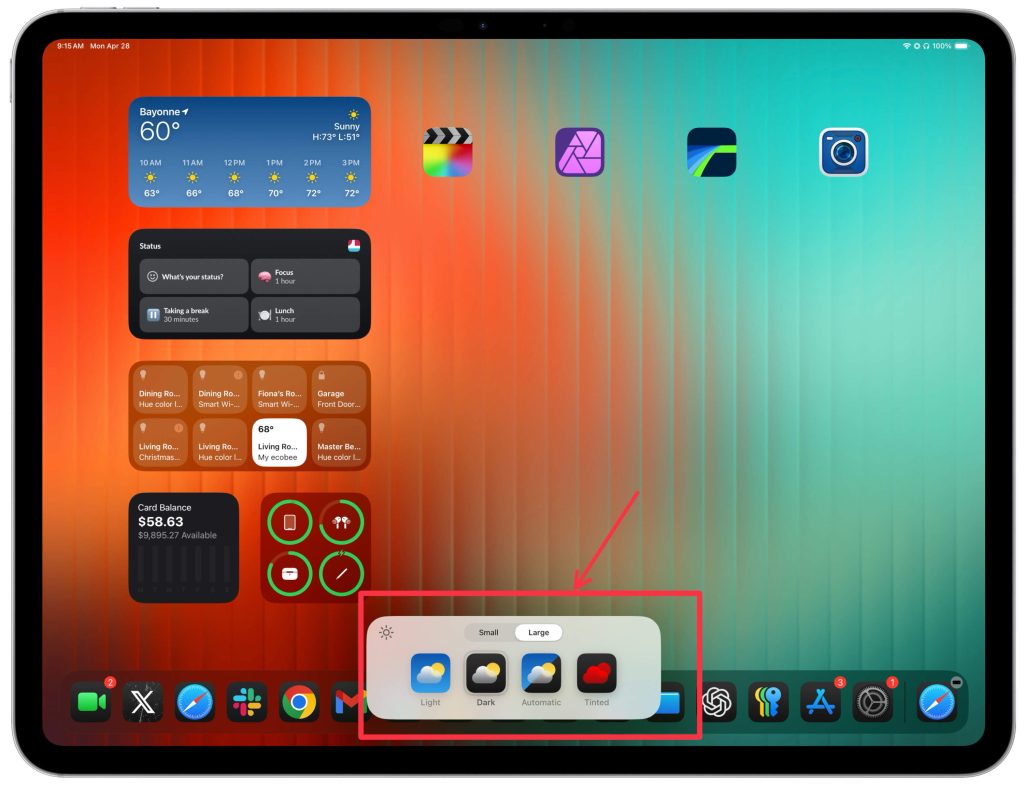 I first wanted to change how my homescreen was set up. I like to have a minimal look to my homescreen because if it’s cluttered, I feel disorganized. Also, for the most part, my iPad is a work machine. So I only wanted the necessary apps to be available to me quickly; everything else was tossed in the App Library. Lastly, iPadOS 18 finally allowed apps and widgets to be placed anywhere on the app grid. This allowed me to return the old Today View from iPadOS 13, which I miss dearly! I also like to change a few settings to perfect my homescreen. Here is what I do: