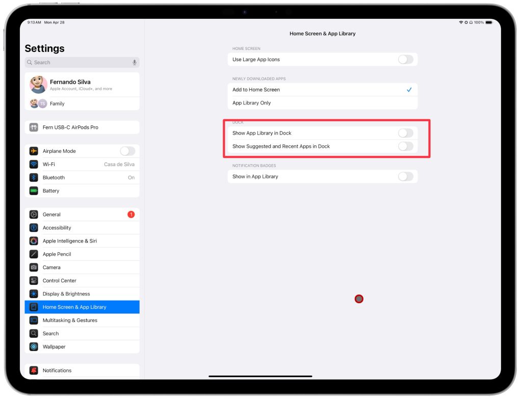 • For the dock, I placed my most-used apps, and I turned off the “show recent” and “show app library” settings. Again, they seem redundant and a waste of space.