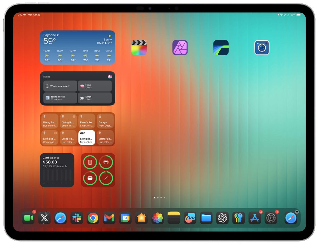 • Use the two leftmost grid columns as a space for my widgets. I use this for information and controls that I need at a glance. So I placed the weather, Notion, Home, battery, and Apple Card widgets.