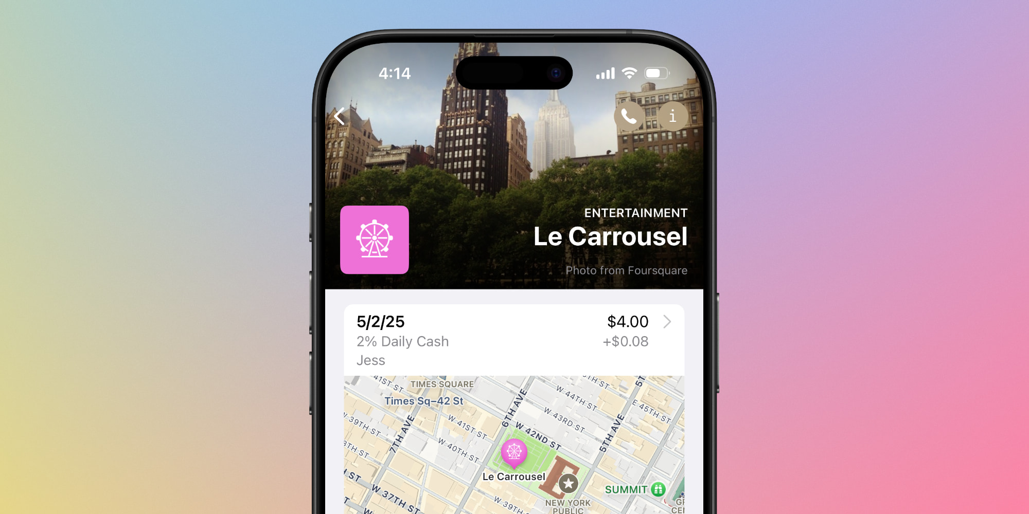 Typically the header image and map thumbnail are enough to help me remember the transaction. But if not, tapping the map brings up the full Apple Maps place listing with more details.