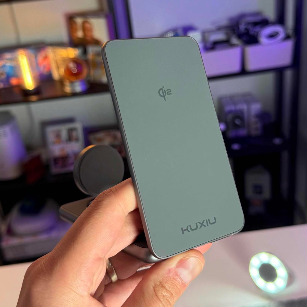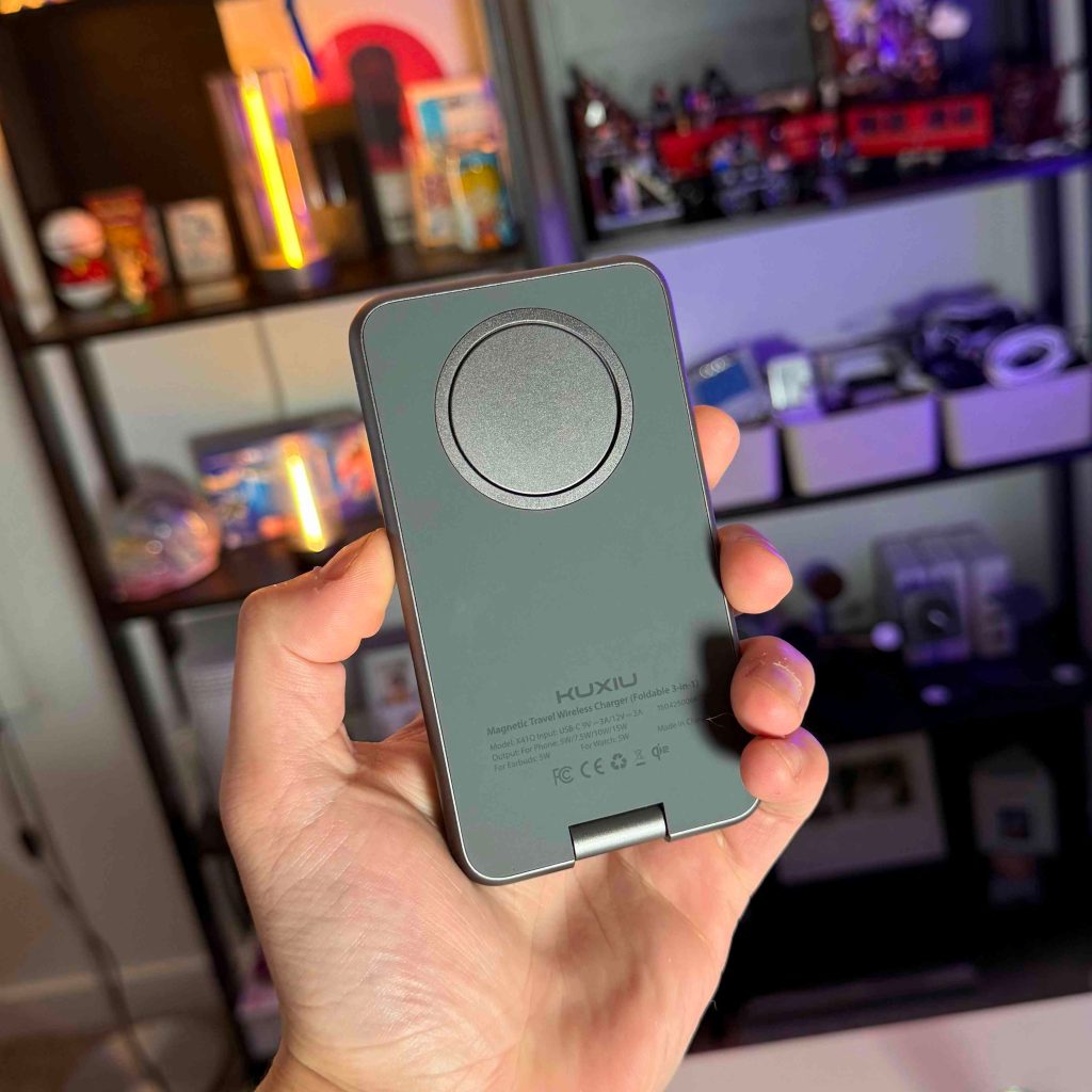 This is Kuxiu’s newest Qi2 charger, which is available today on their website for $74.99. It’s available in two colors: Gray or Natural Titanium. This is now my wife’s travel charger of choice because it fits in any scenario.