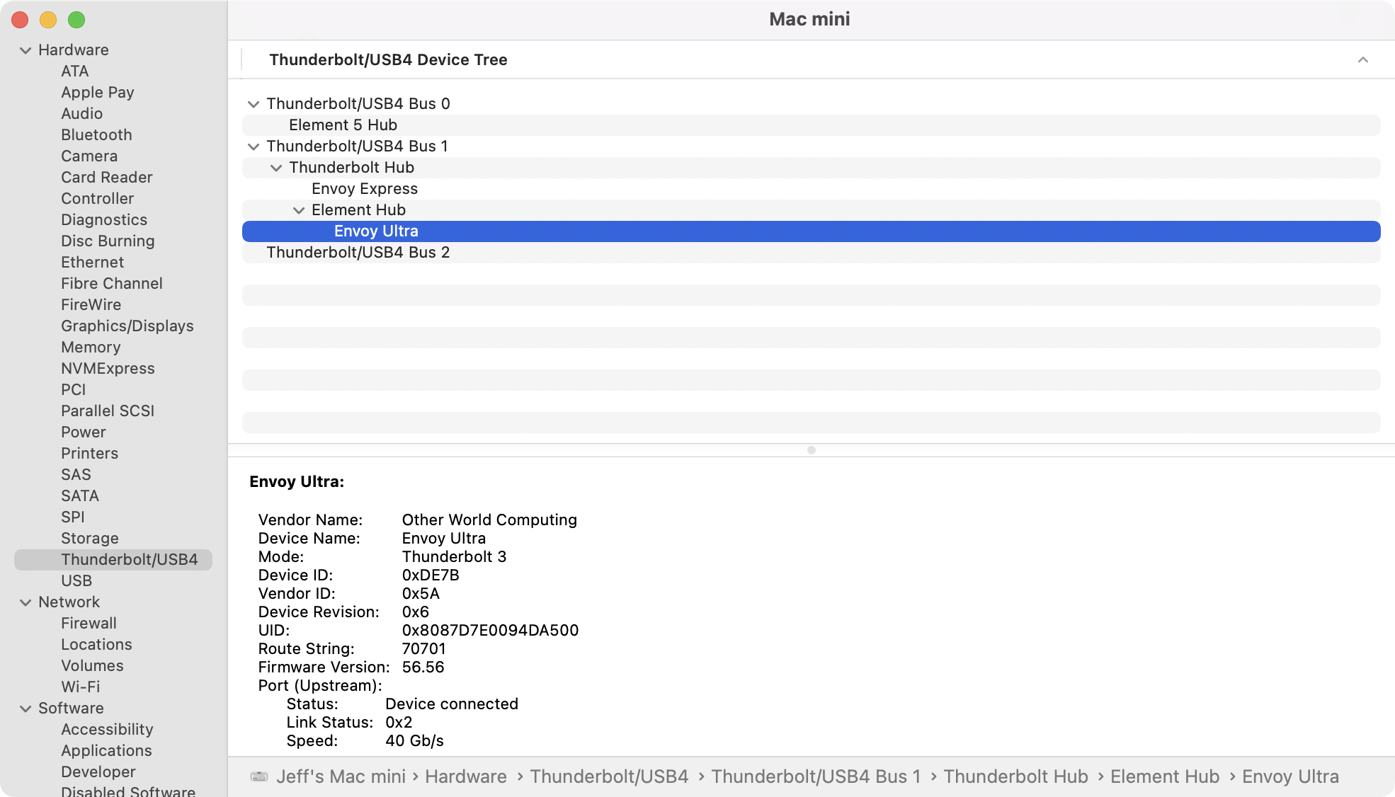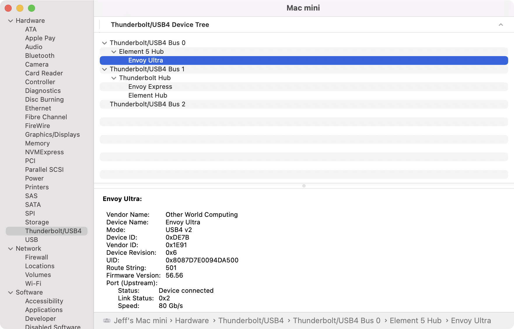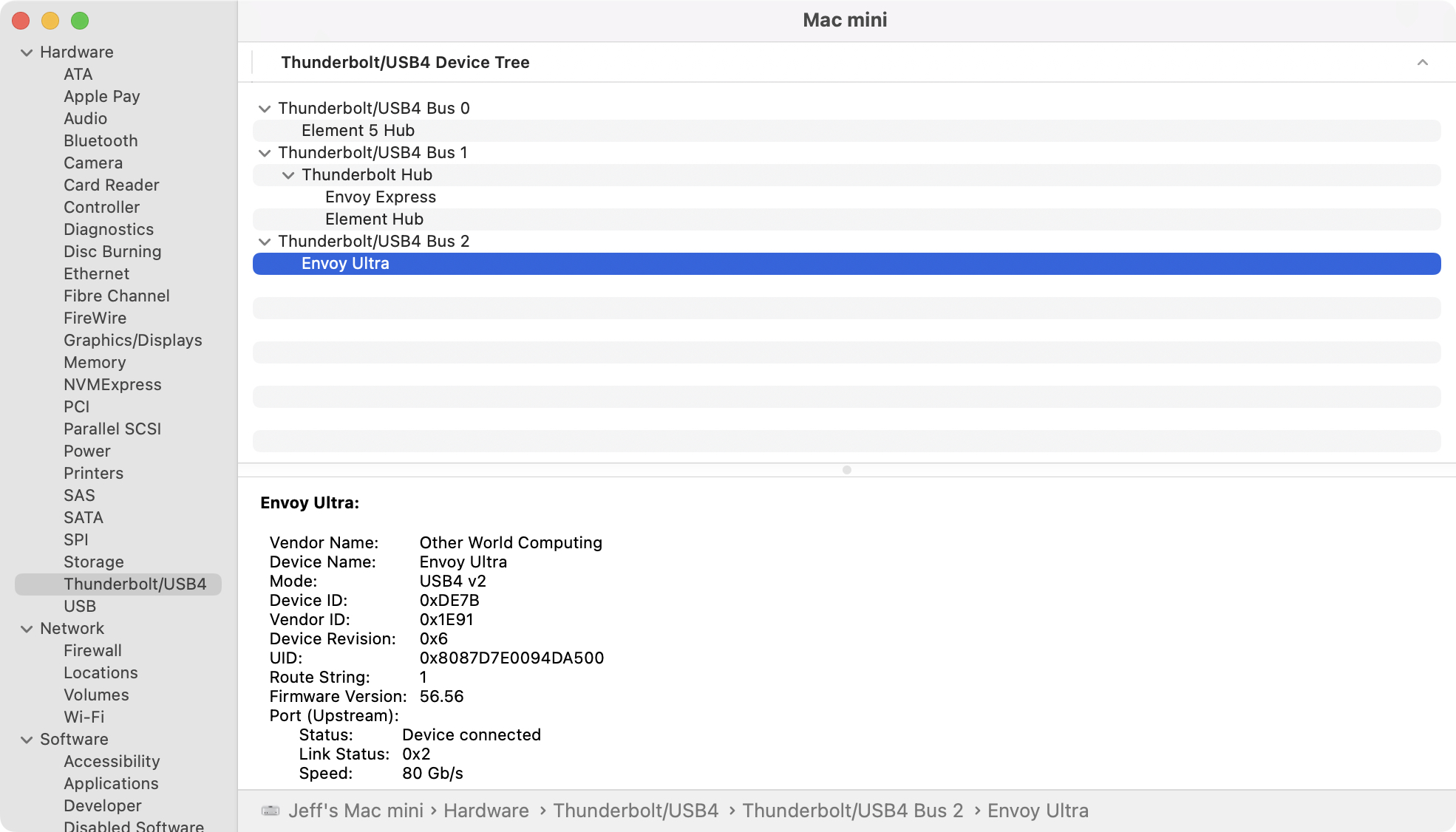 Finally, let’s connect the Envoy Ultra to the CalDigit Element 5. System Information reports a 80Gb/s link speed, as expected.