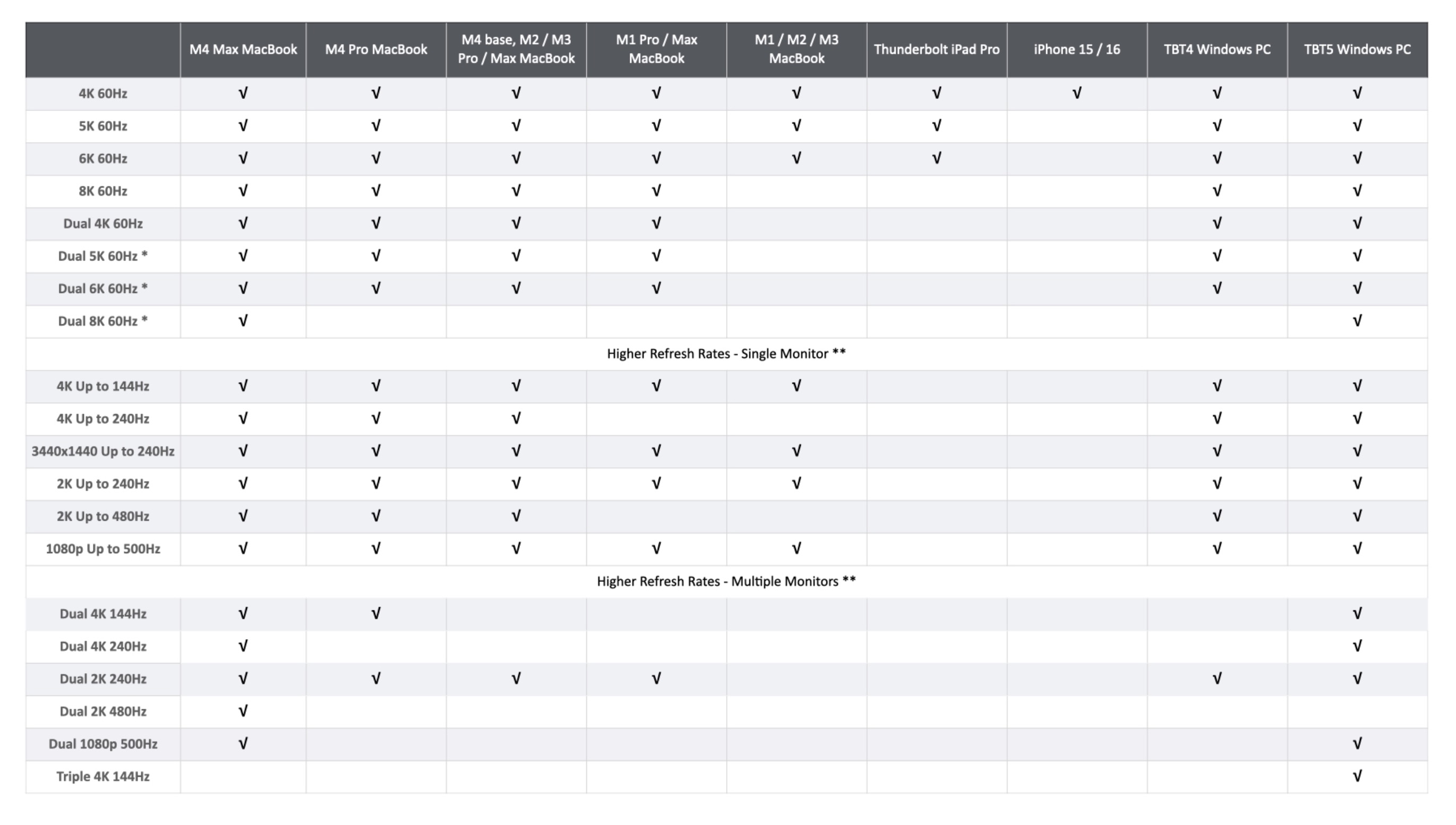 Users running macOS can connect up to two 6K displays at 60Hz via a single thunderbolt connection. M4 Thunderbolt 5 Macs do not support triple displays via a single Thunderbolt 5 connection, but Thunderbolt 5 PCs will. The display situation via macOS has always been an ostensibly complicated one – take a look at the fine print listed here for proof of that. CalDigit put together this chart to help explain what display configurations are supported, but you’ll still need to look at the asterisks to get the full picture.
