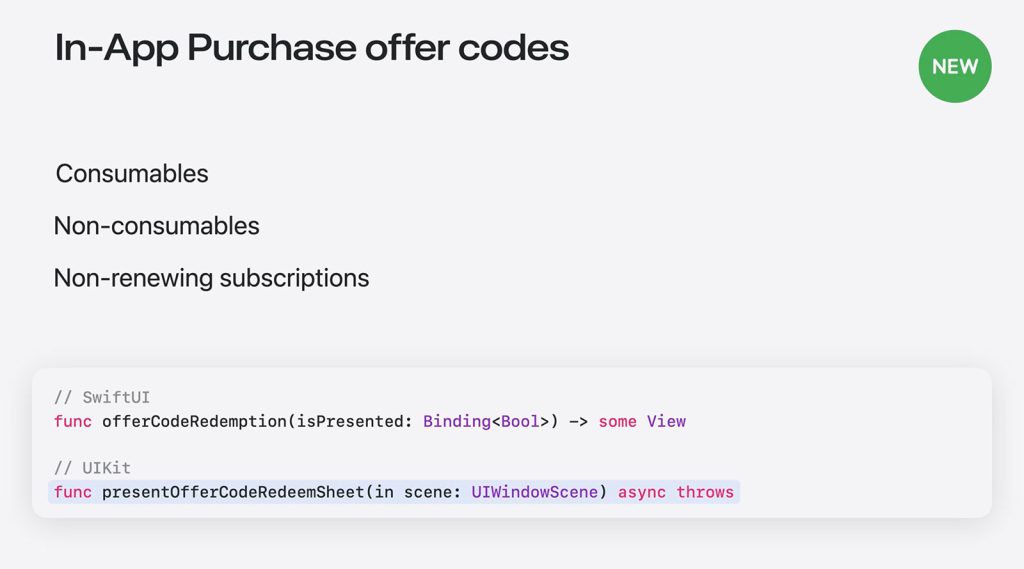 Apple detailed the changes in a WWDC25 session called “What’s new in StoreKit and In-App Purchase“, in which it explained that the new redemption flow will work within apps using the existing offerCodeRedemption API, or via the system UI for apps built with UIKit using presentOfferCodeRedeemSheet.