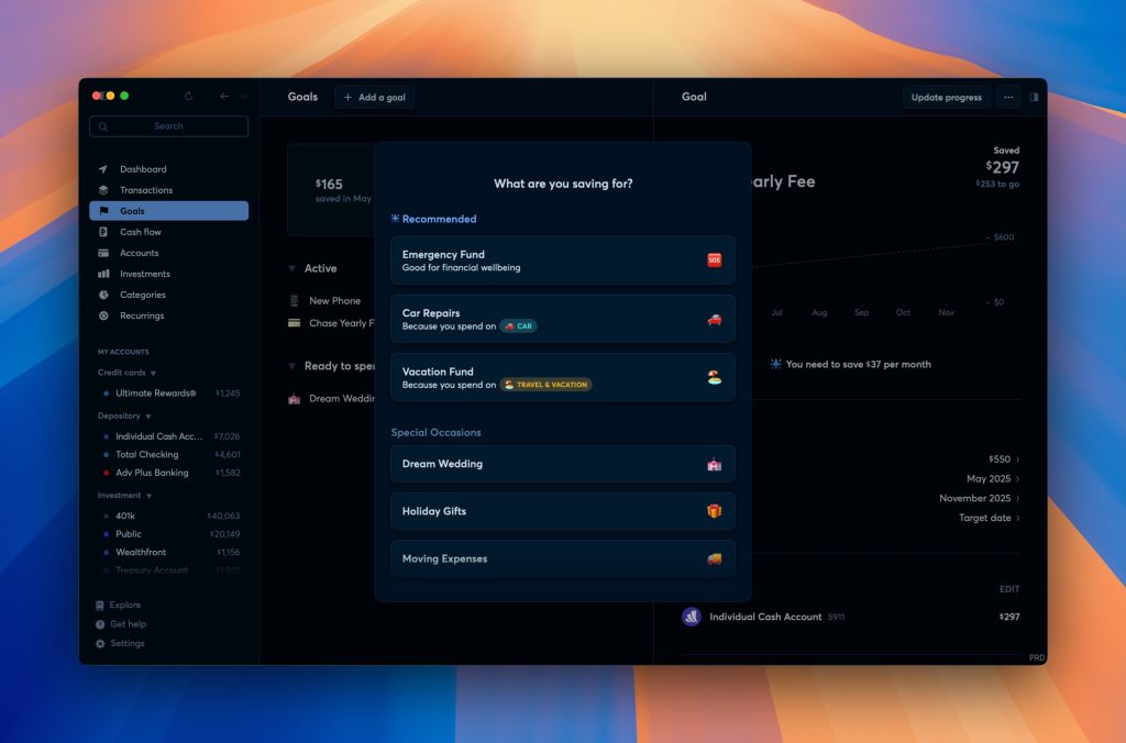 Now you can set money aside for the things that matter to you—like a down payment, a vacation, or building an emergency fund—all from the brand new Goals tab. Not sure what you’d like to save for or where to begin? Copilot Money Intelligence will suggest goals based on your current cash flow, spending categories, and yearly recurring payments. It will also give you an estimate of how long it might take to reach each goal or how much you’d need to save to get there.