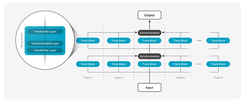 Traditional Transformers process tokens through a single stack of layers, one after the other. But rather than using this single-track approach to calculate every token, Apple’s design splits the model into multiple, parallel tracks. Each track processes tokens independently, and only syncs up at certain points.