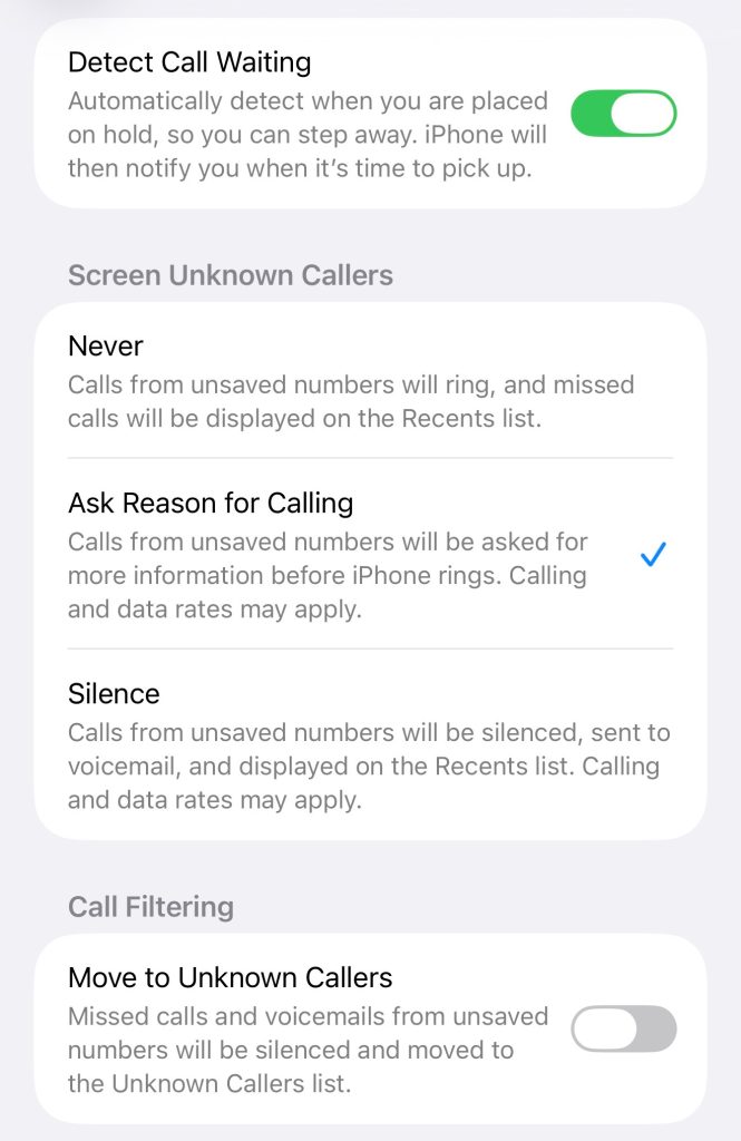 Phone now has updated settings around silencing unknown callers and managing the new call screening feature.