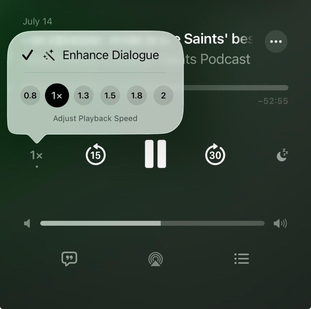 The Podcasts app now includes an “Enhance Dialogue” feature that improves voice clarity. Playback speed options now range from 0.5x to 3x, and you can set different speeds for different shows. Still no skip silence feature. Apple only offers that in the Voice Memos app. The super slow and super fast new speed features are truly hidden features, too, as they only appear when you adjust speed. The visual range indicator is limited to human listening speeds.