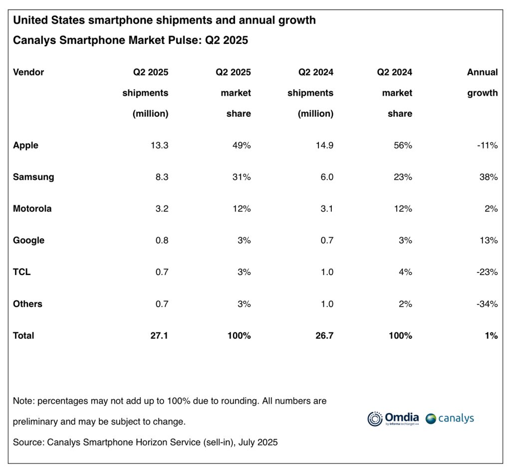 According to Canalys, while the overall US smartphone market grew just 1% in Q2 2025, reaching 27.1 million units, up from 26.7 million a year earlier, Samsung posted the strongest performance of any vendor. The Korean company shipped 8.3 million units, a 38% increase year over year, with its market share rising from 23% to 31%.