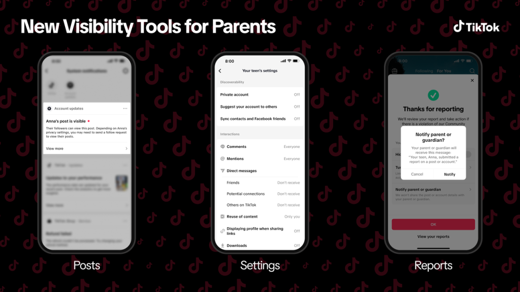 - Automatically notify a parent when their teen uploads a video, story, or photo that’s visible to others on TikTok. This helps parents stay informed and start open conversations about what their teen is posting, without disrupting a teen’s creativity or independence.