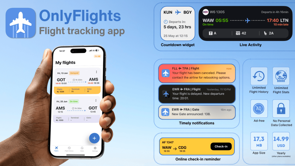 OnlyFlights offers everything you’d expect from a flight tracker, including notifications for status changes – such as gate changes, terminal updates, schedule changes, delays and so on. It has Live Activities for flight information, flight history tracking, and all of the info you’d need for your flight. To put a cherry on top, it also has nice quality-of-life features like home screen widgets to count down to your next flight.