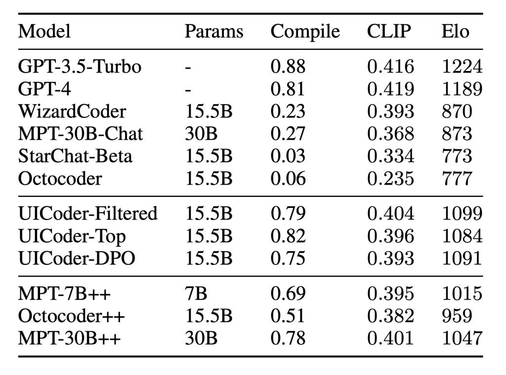 UICoder also came close to matching GPT-4 in overall quality, and actually surpassed it in compilation success rate.