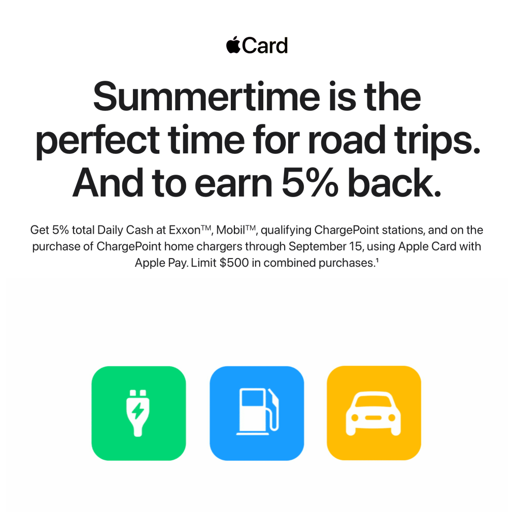 For the next month or so, Apple has a special promotion for those heading out for Summer road trips (or anyone else who drives and has an Apple Card) – allowing users to earn a higher 5% cash back rate at Exxon/Mobil gas stations, as well as qualifying ChargePoint EV charging stations.