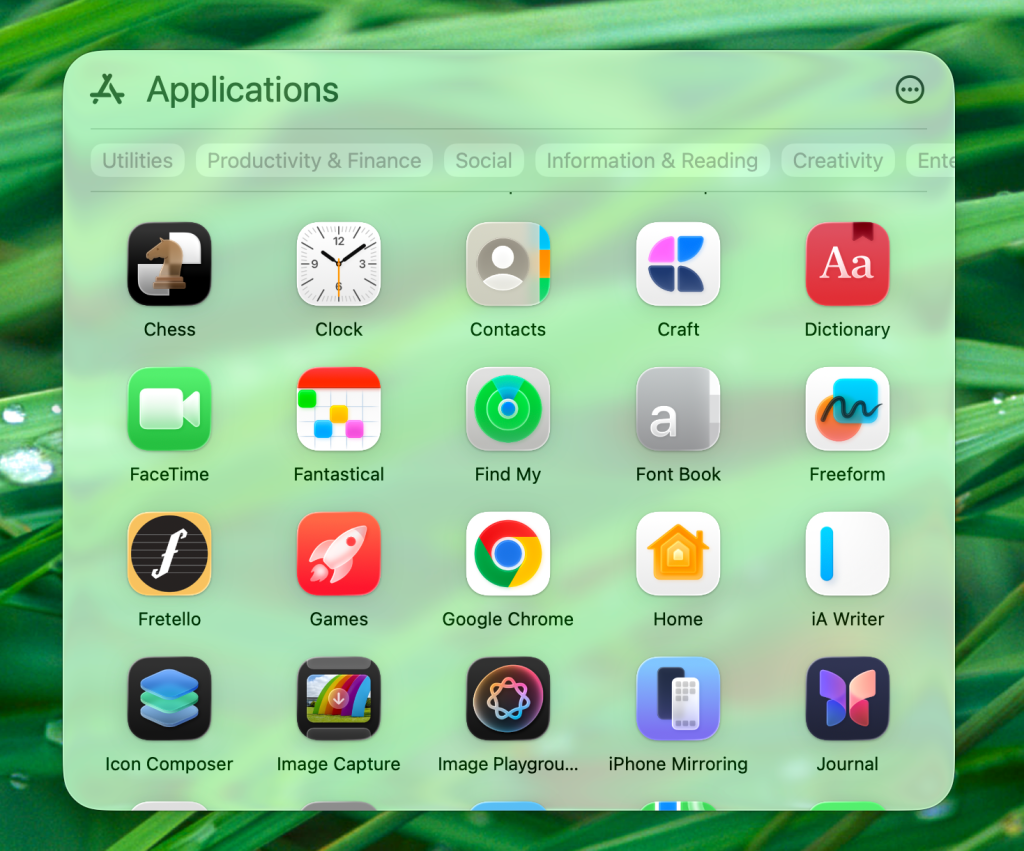 By setting it to display as a stack and choosing Grid view, you get a quick, compact launcher that feels like a middle ground between Finder and Launchpad. It lacks the full-screen iOS-like presentation, but it’s efficient, familiar, and already integrated into macOS without third-party software.
