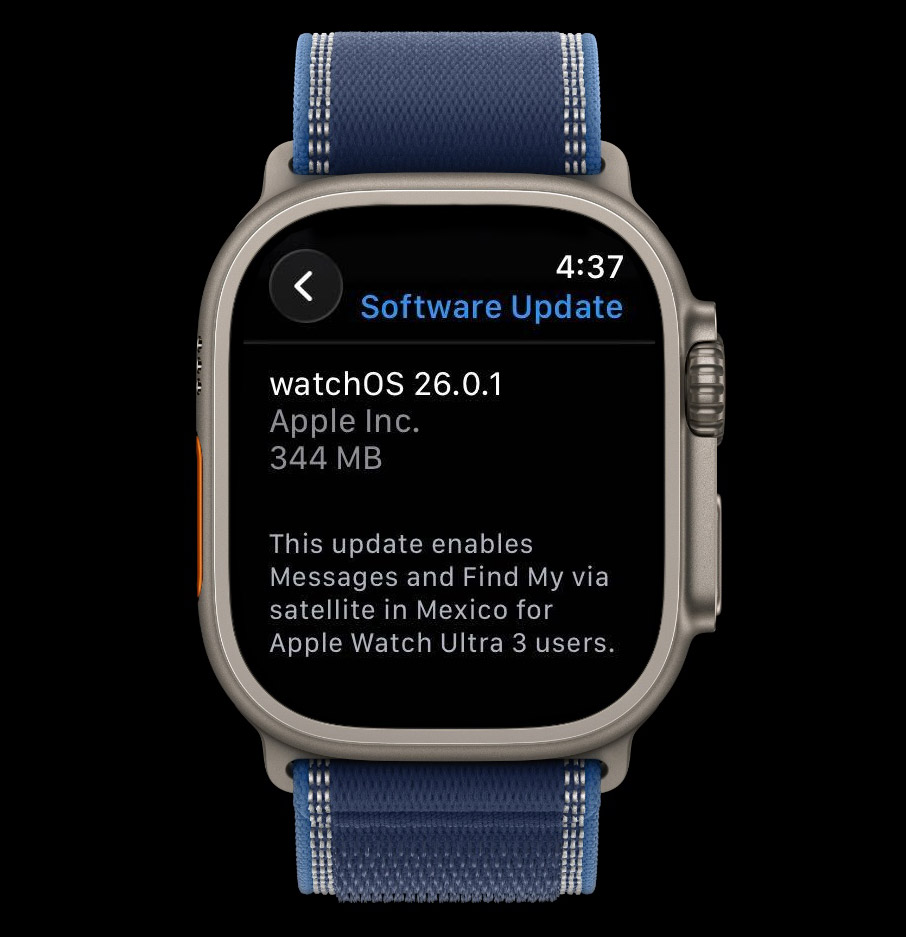 “This update enables Messages and Find My via satellite in Mexico for Apple Watch Ultra 3 users.”