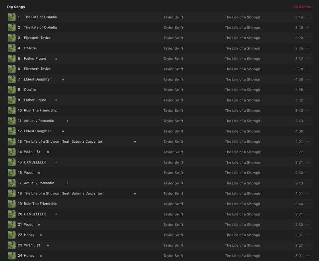 Less than 24 hours after releasing the two versions of her new album, all songs from The Life of a Showgirl are now topping Apple Music’s Top Songs chart in the US.