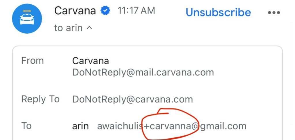 All the emails from these services will still land in your inbox as normal, but now with the +alias we specified. If you receive an email from other companies referencing the address youremailaddress+carvanna@gmail.com, you will know where they got it from.