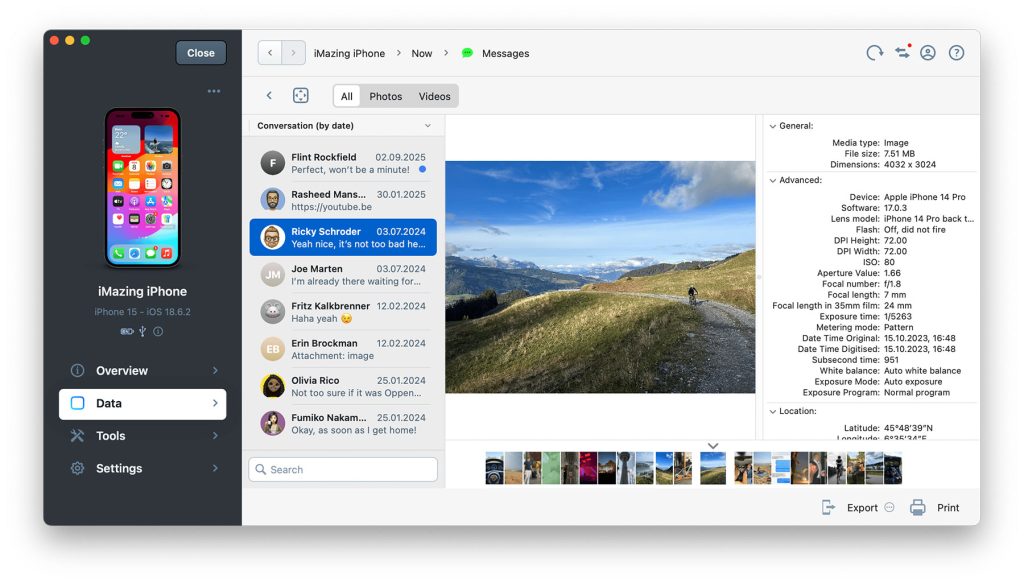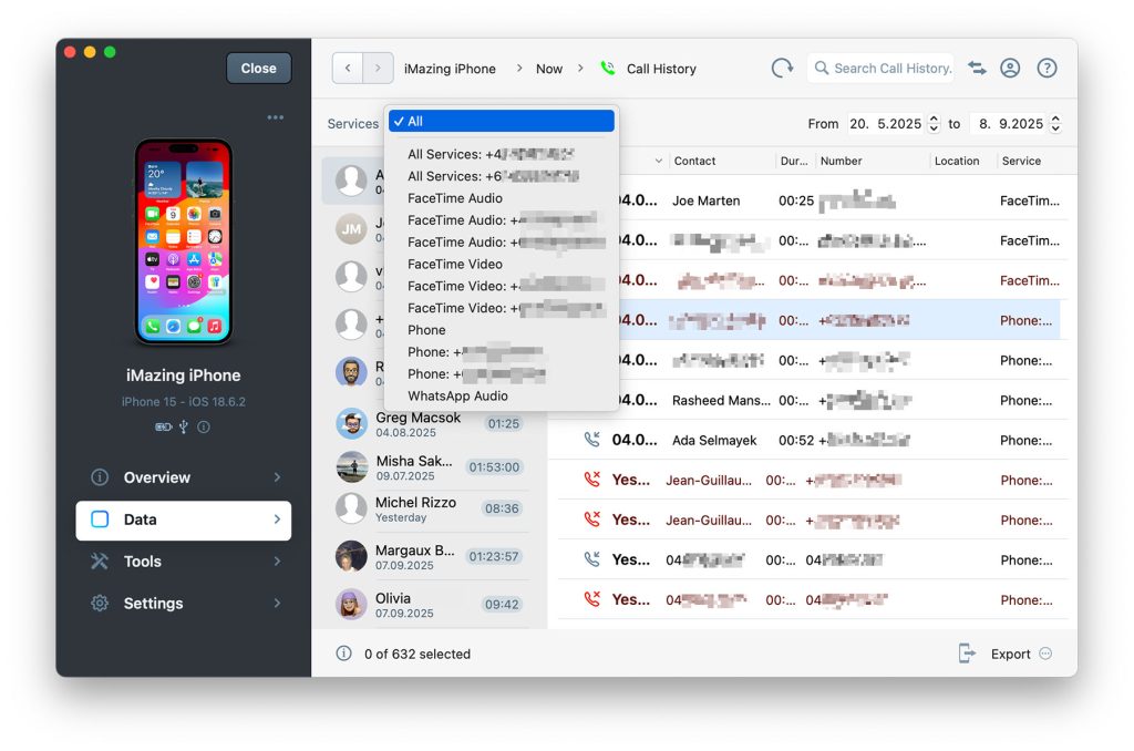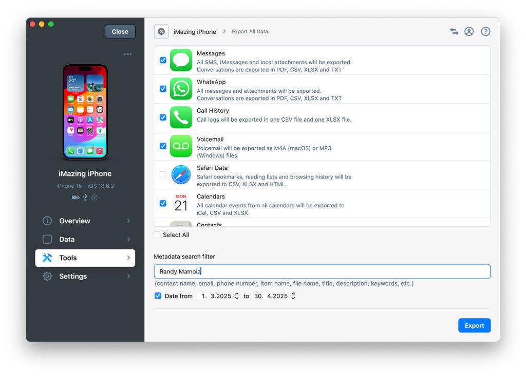 As many iMazing users know, exporting data is a core feature of the platform. With that in mind, the “Export All Data” tool got even more powerful, offering more granular controls to refine exports by contact name, file name, keywords, or even date range.