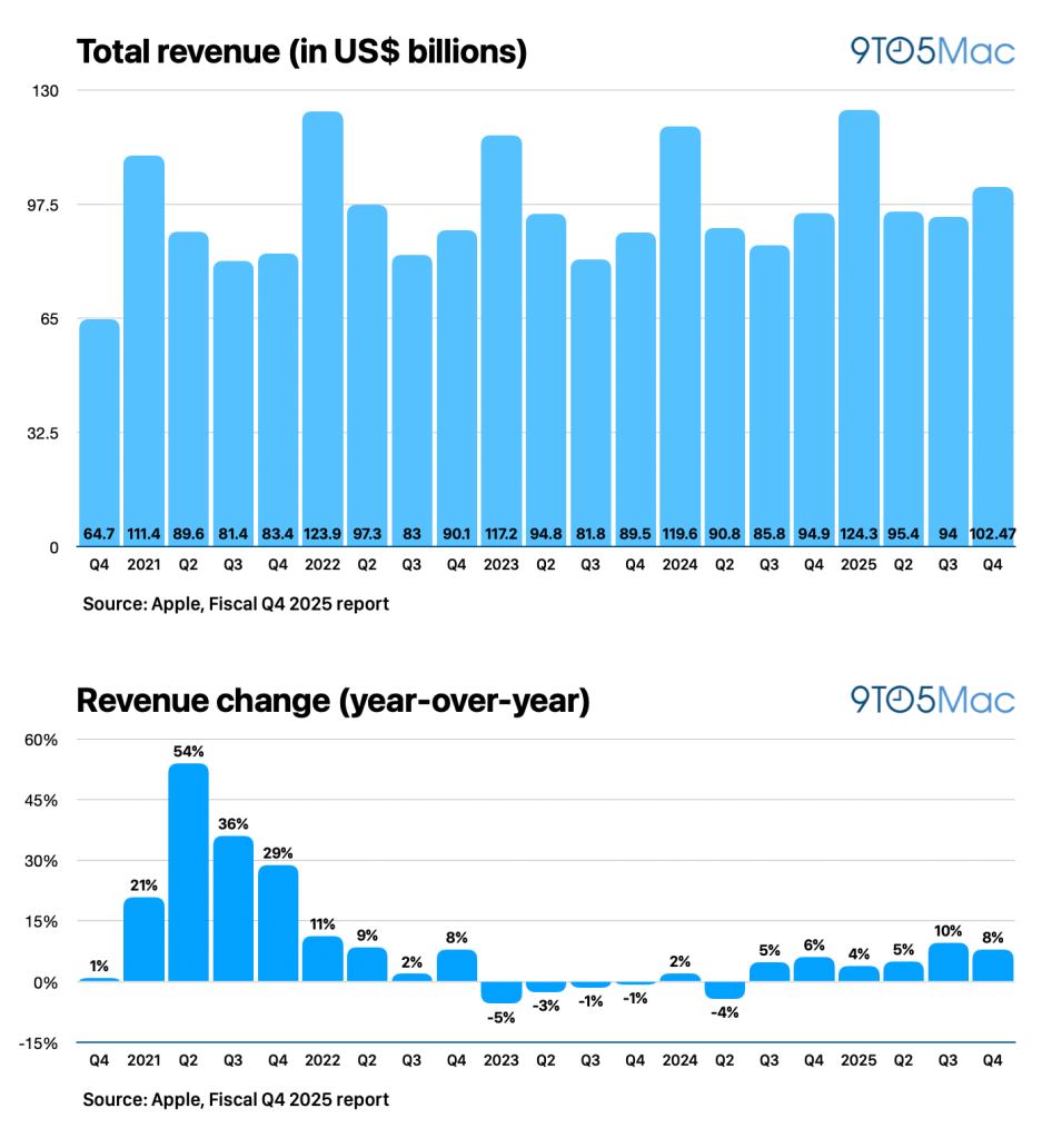 Apple just announced its earnings report for fiscal Q4 2025, ended September. The company generated $102.47 billion in revenue, up 8% from the same quarter last year, and slightly above the expected revenue of $102.24 billion. Here’s the full breakdown.