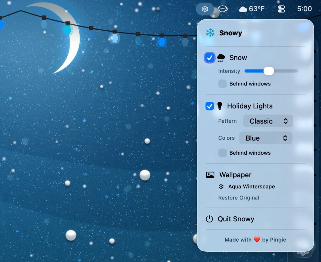 Snowy lives in the Menu Bar on your Mac. From there, you can toggle both snow and holiday lights on and off. You can also decide to always show snow or hide snow behind open app windows. Snow intensity can also be adjusted from the default to adjust how much snowfall appears when active.