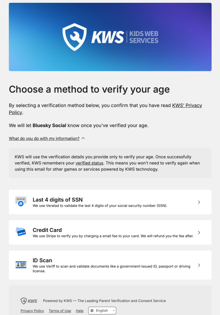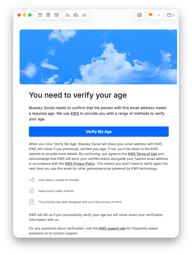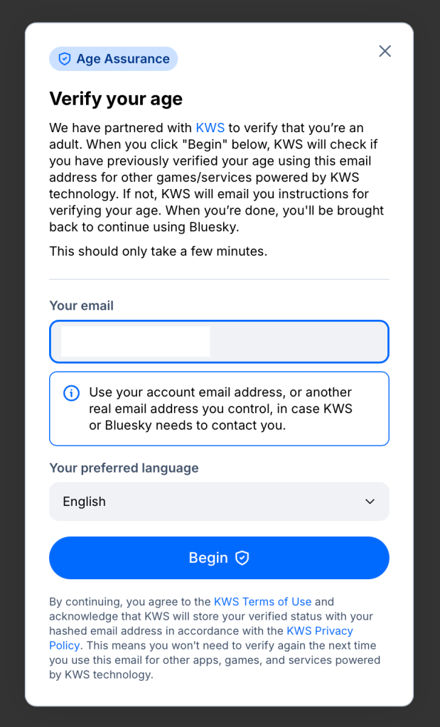Selecting the “Begin” button prompts Bluesky to email you a link to start age verification through KWS. The websites linked throughout this process take you here and here.