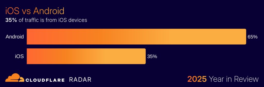 Cloudflare also noted that “iOS devices generated 35% of mobile device traffic globally,” with Android accounting for 65%. Still, “the share of traffic from iOS grew slightly year-over-year, up two percentage points to 35% in 2025”.