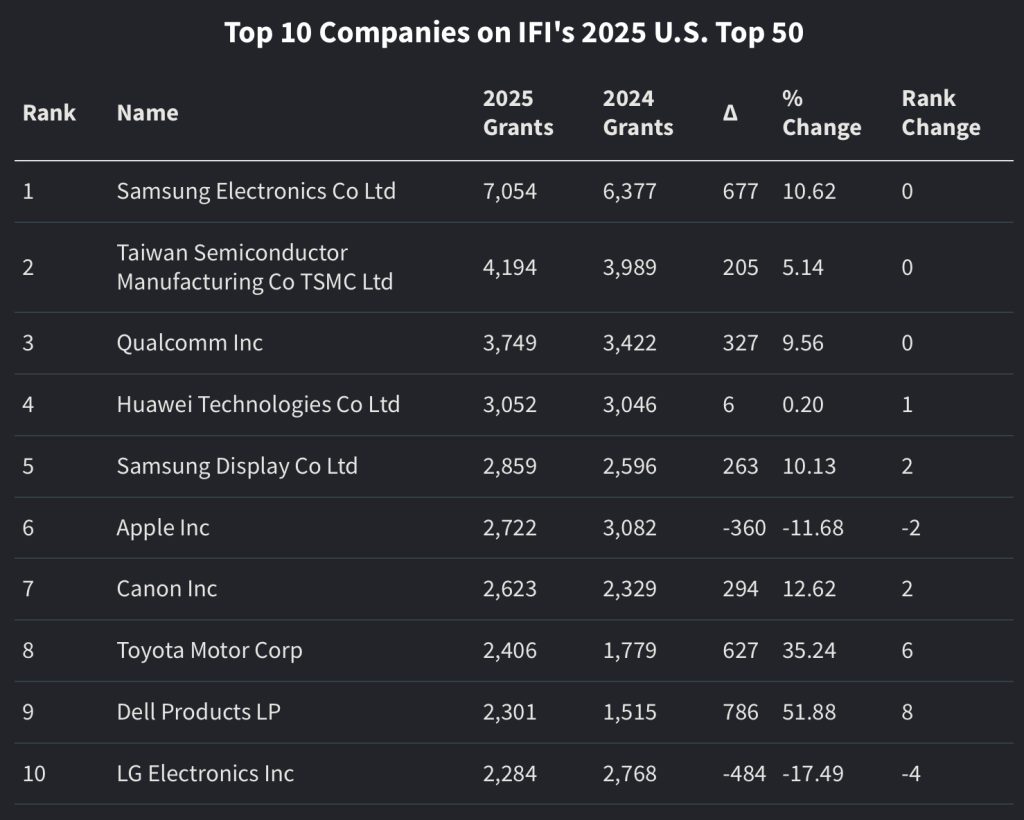 As for Apple, the company received a total of 2,722 patent grants in 2025, a 11.6% decrease compared to its 3,082 grants in 2024. Samsung Electronics led the pack with 7,054 patent grants for the year, up 10.6% year-over-year, followed by TSMC, Qualcomm, Huawei, and Samsung Display. Trailing behind Apple were Canon, Toyota, Dell, and LG Electronics, rounding out the top 10.