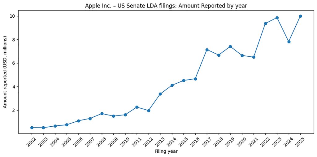 9to5Mac checked the US Senate Lobbying Disclosure Act records and found that Apple spent an even $10 million on federal lobbying in 2025. That is a 27.9% increase from 2024, and marks the company’s highest annual lobbying total on record.