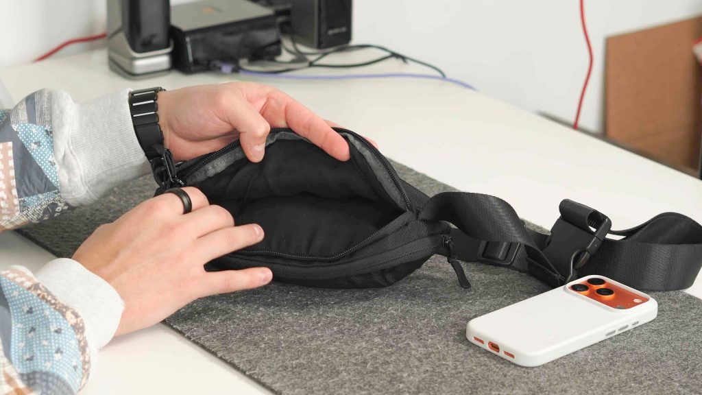 What I really like is how practical it feels day to day. It sits cross-body comfortably, doesn’t flop around when walking, and has just enough structure to protect everything without feeling too stiff. The main pocket is lined with microfiber to help protect items like your iPhone. While the other compartment has multiple pockets for different-sized and shaped items.
