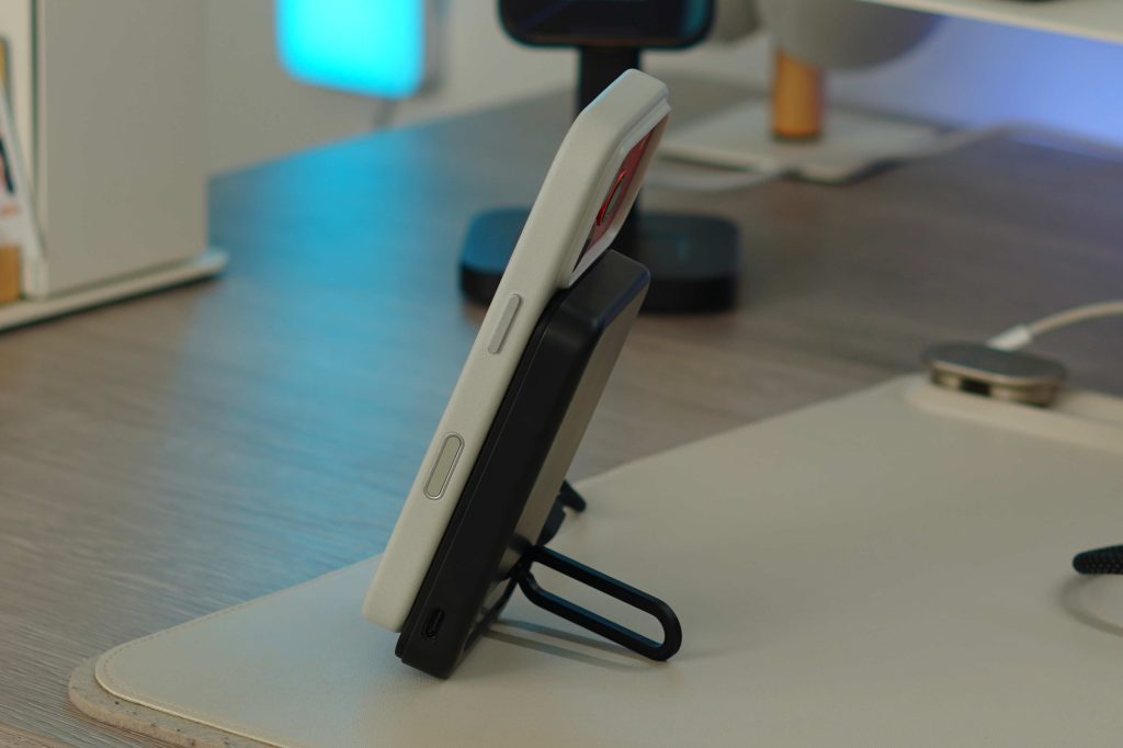 The kickstand is another practical touch. It works well for watching content, FaceTime calls, or using Standby mode on your iPhone, and it doesn’t feel like an afterthought. The kick stand sits on top of the small LCD that gives you everything you need. It displays the battery percentage, active charging modes, Qi2.2 status, and when the power bank is being recharged. Overall, this feels like a thoughtfully designed power bank that focuses on reducing friction, fewer cables, faster charging, and more flexibility in how you use it.