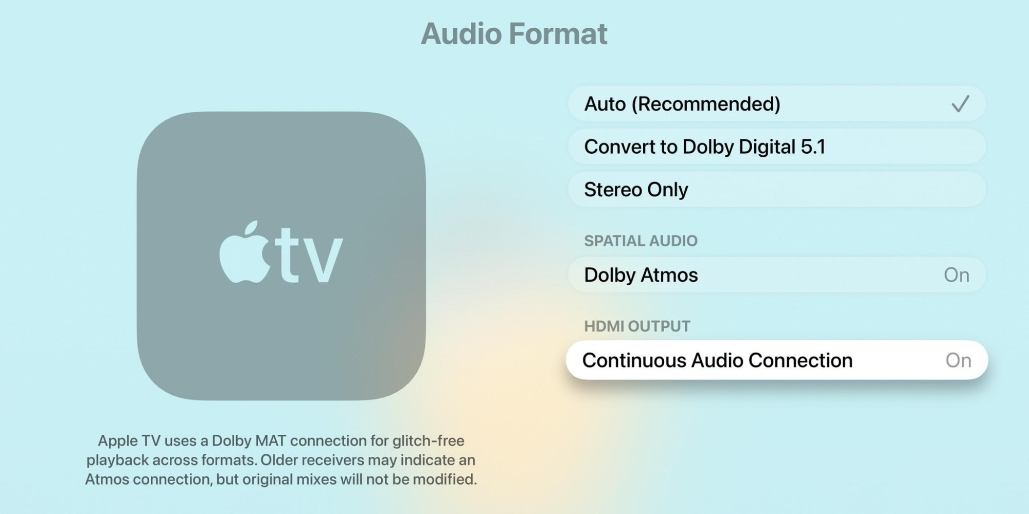 Apple TV uses a Dolby MAT connection for seamless transitions across formats. Older receivers might indicate Atmos, but the original audio will play as intended.
