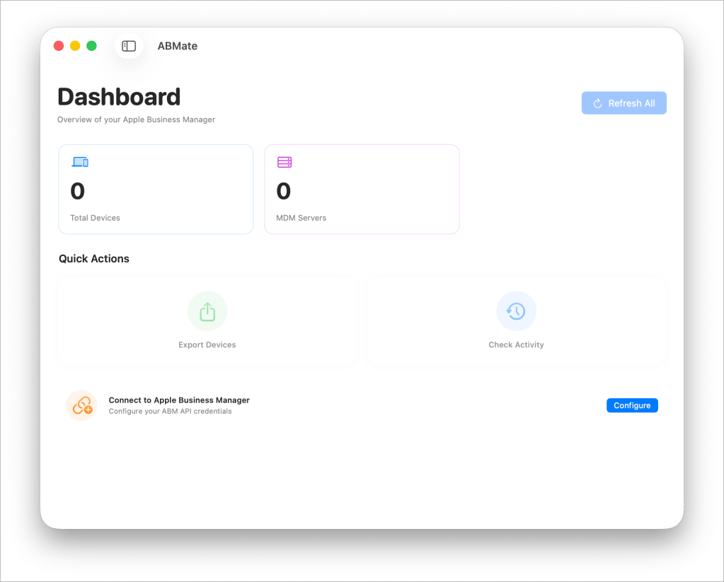 ABMate is an open-source tool that wraps the Apple Business Manager API in a native macOS interface. It is written in SwiftUI, so it feels right at home on your Mac. The premise is simple: instead of logging into Apple Business Manager to check a device status, you open ABMate. Because it communicates directly with the new Apple Business Manager API, it pulls data much faster than rendering the official portal’s site.