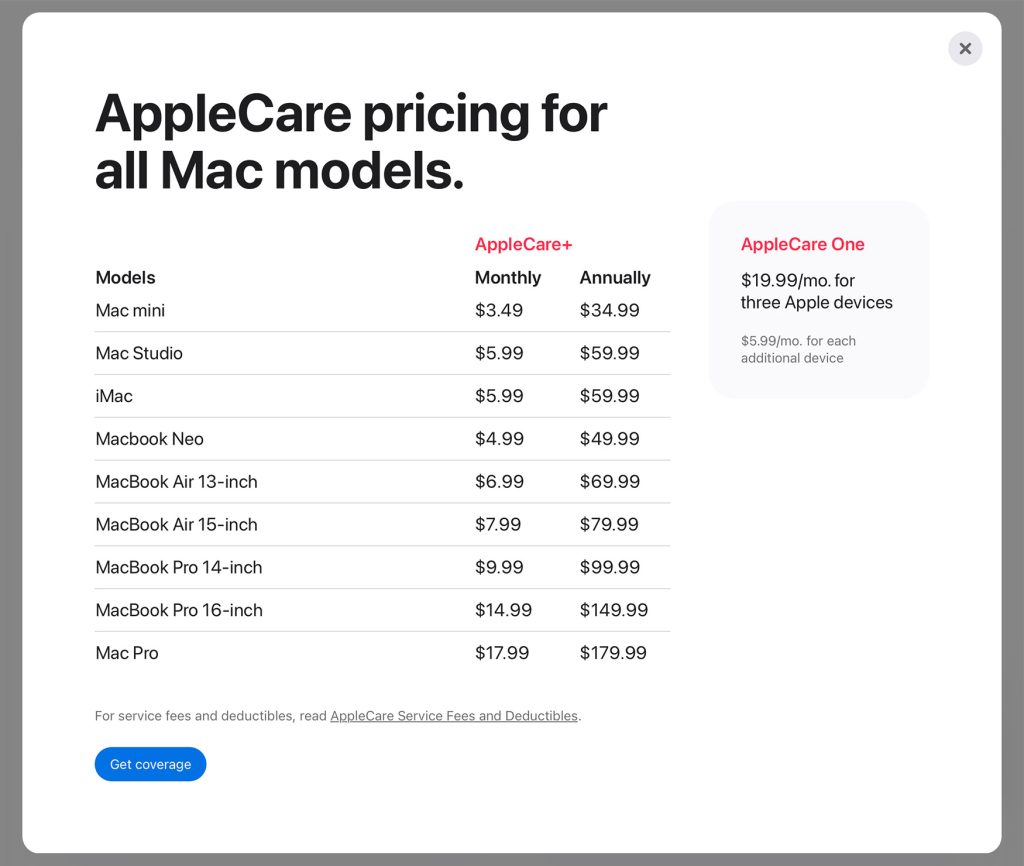 Finally, AppleCare One subscribers can add the new MacBook Neo to their list of covered devices at no additional cost if they don’t yet have three devices in the plan, or for an extra $5.99 per month otherwise.