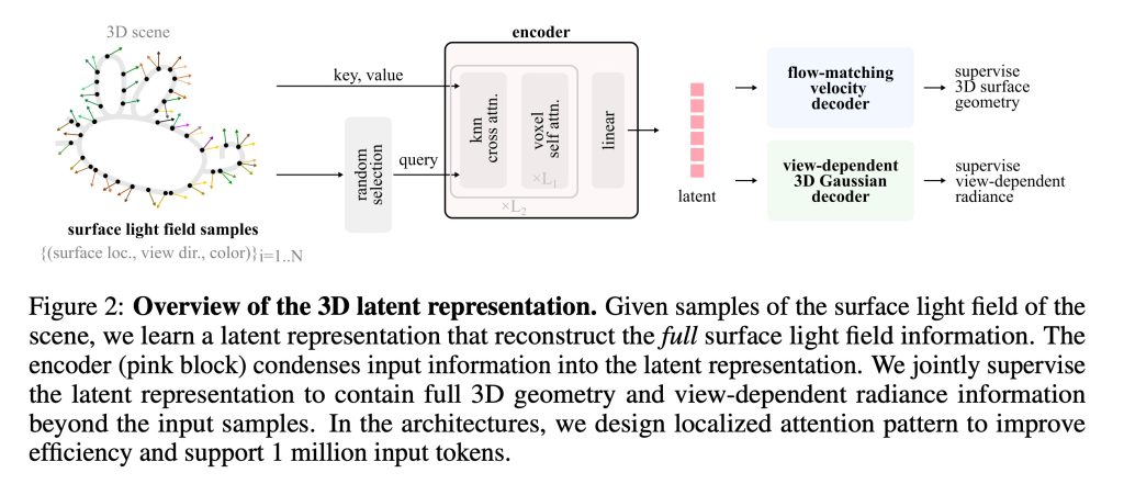 - First, an encoder compresses the information about the object into a compact representation in latent space. So, instead of storing every visible detail, it learns a condensed mathematical description of the object’s shape and how light interacts with its surface.