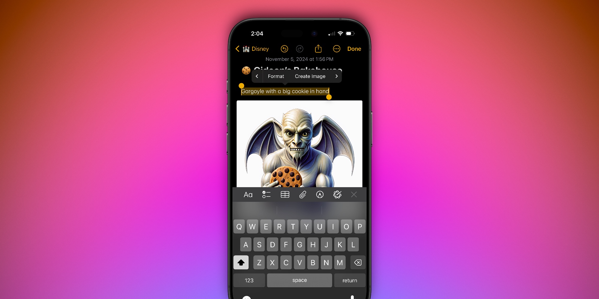 But even if a simple sketch is beyond your artistic know-how, you can also create Image Wand images with no starting base at all. That’s because Image Wand can analyze the text surrounding it and create an image that fits your note’s contents. This works just by using the existing ‘Image Playground’ option in the attachment toolbar.