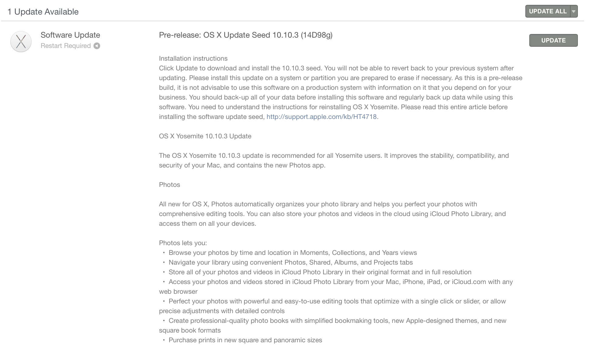 Apple today released the first Public Beta of the upcoming OS X Yosemite 10.10.3. The new release includes the iCloud-based Photos application for the Mac, new Emojis across the system, and simpler login to Google accounts for profiles with two-factor authentication enabled. This beta is labeled as build 14D87, which is the same as the second 10.10.3 beta for developers, which was released a week ago. The Public Beta is available in the Mac App Store Software Update tab for registered beta users. Apple plans to release the first Public Beta of iOS 8.3 in mid-March, according to sources. Thanks, DJ!