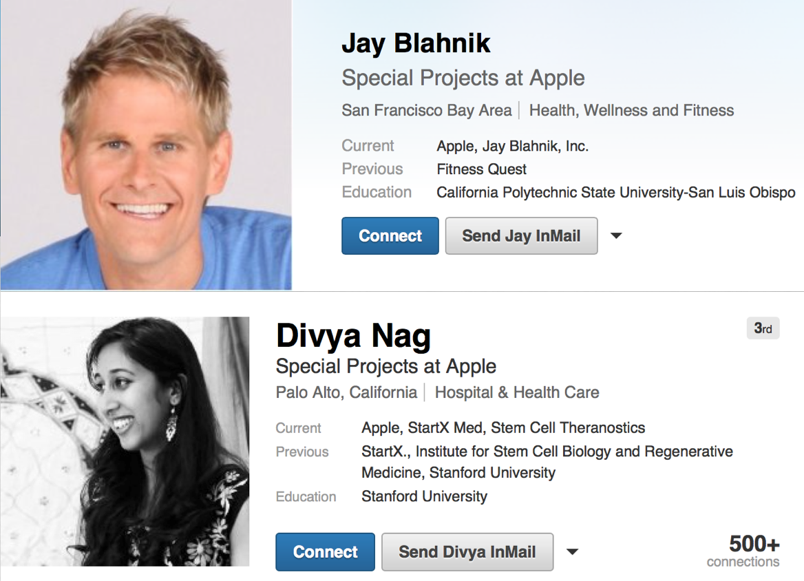 Two key members of the Apple team working on the iWatch/iBand (or your favorite “i” + wearable nickname) have confirmed their new jobs at Apple via their LinkedIn profiles. Jay Blahnik, formally a key advisor on the Nike FuelBand project and a world-renowned fitness expert, joined at Apple in July of 2013. Divya Nag, a rising star in the medical research world with experience in FDA approvals, joined Apple in April 2014.