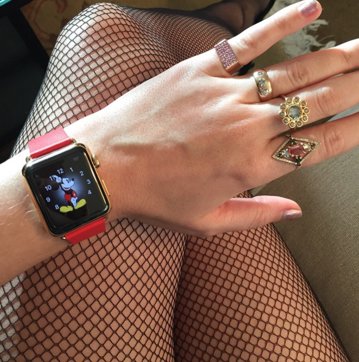Pharell has the Apple Watch Edition with white band, but Perry has the more luxurious red leather version. Both celebrities seem to share a love for the Mickey Mouse face however.