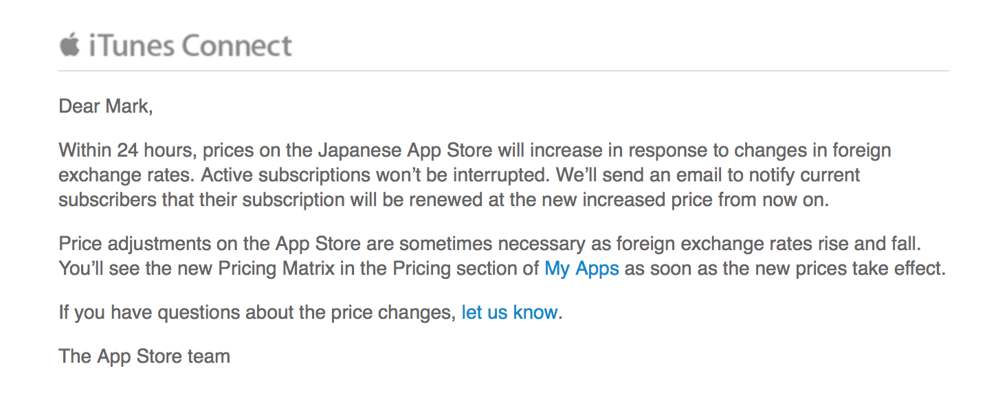 Apple today informed developers that, within 24 hours, prices in the Japan App Store will increase due to foreign exchange rate changes. Apple further tells developers that customers currently using subscription-based apps will be notified as needed of the shifts. This is not the first time Apple has increased prices in its App Store. Late last year, Russia prices increased, while pricing in Canada and some European regions changed in January of this year.