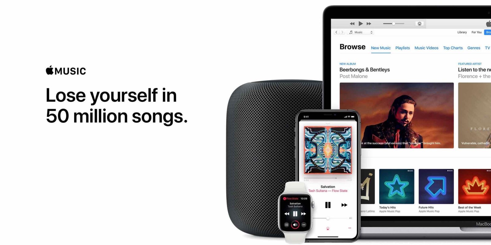 Apple Music is a streaming service that includes 50 million songs and is available on iOS, macOS, HomePod, Apple TV, Apple Watch, Sonos, Fire TV, Amazon Echo, and Android.