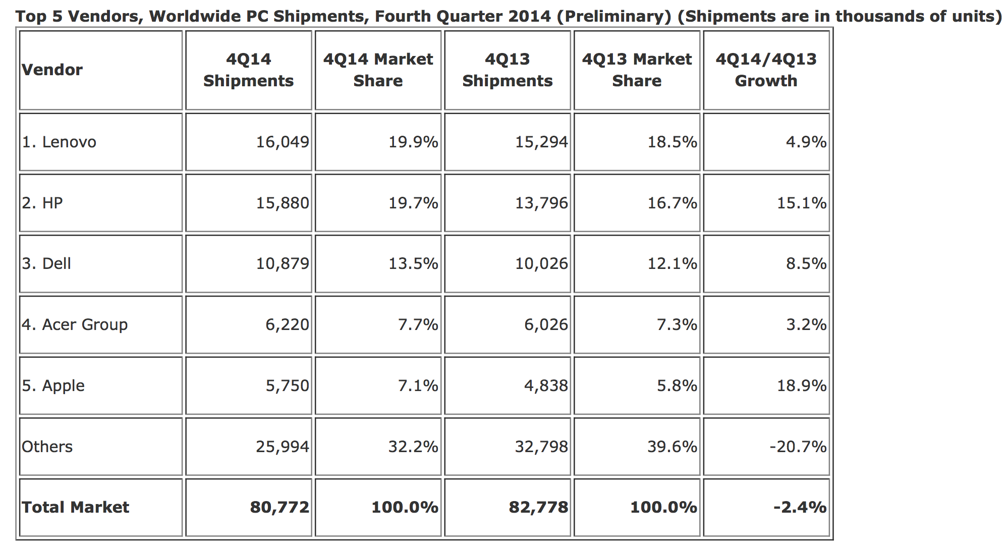 Analysis firm IDC today put out its projected numbers for PC growth in Q4 of 2014, and these results are better than projected. IDC initially predicted that unit sales for PCs would fall 4.8% year-over-year in Q4, but, instead, the market only fell 2.4%. While the decrease in growth is not as weak as expected, IDC still notes that 2014 is the third consecutive year of slow-down in the PC market. Many analysts have attributed the lack of recent growth to the uptake in purchases and usage of both tablets and large-screen smartphones…