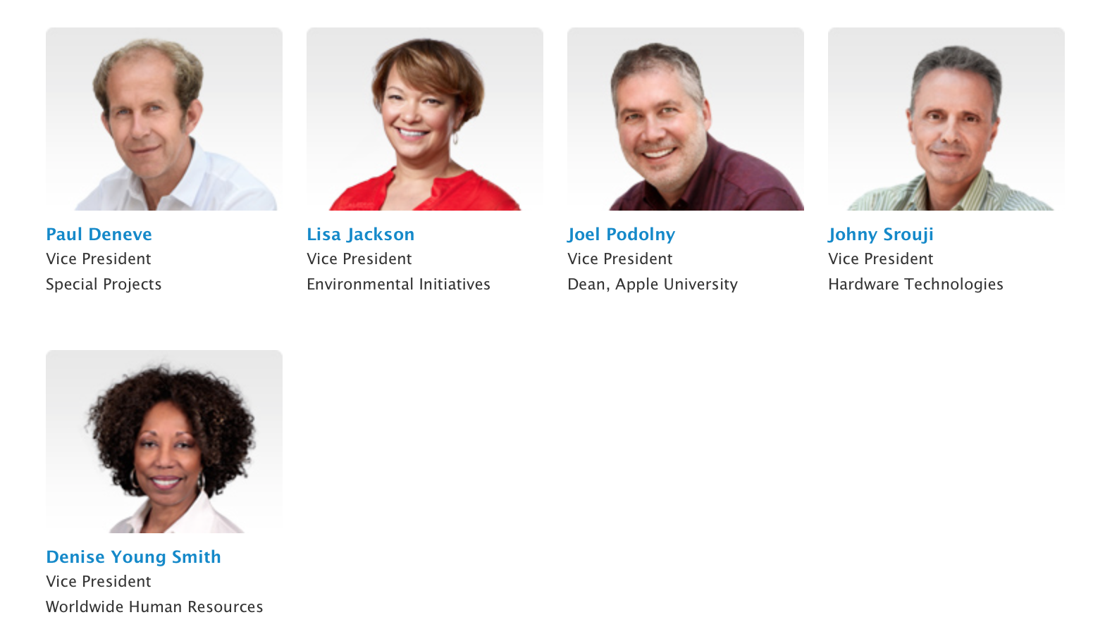Apple today has expanded its Executive Leadership Team to include notable Apple Vice Presidents. The team shown on Apple’s official PR Bios website now includes Vice President of Special Projects Paul Deneve, Vice President of of Environmental Initiatives Lisa Jackson, Vice President and Dean of Apple University Joel Podolny, Vice President of Hardware Technologies Johny Srouji, and Vice President of Worldwide Human Resources Denise Young Smith.